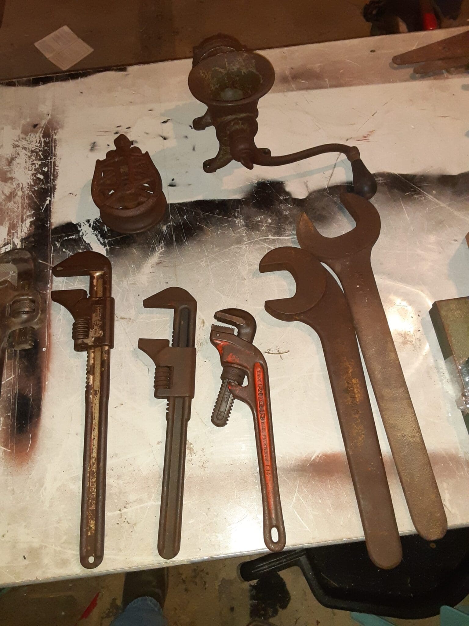 Tools & Misc. : 3 S&K socket sets, pipe wrenches, post pounder, Maytag, Diamond and Ford wrenches, pitch forks, hay trolley, sleds, #32 meat grinder, White Mountain Jr. ice cream freezer, large bolt bin, wooden ladders, air horn, lumber and R.R. carts, crosscut saws, Kennedy tool box, more tools.